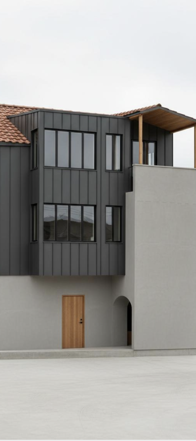 Un volume en bardage métallique sombre vient se poser sur un socle minéral existant. Le contraste entre ancien et contemporain structure la lecture architecturale.